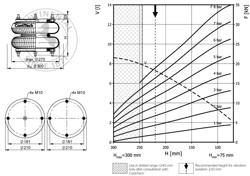 Тип пневмоподушкиМин. высота монтажа (мм)Макс. диаметр (мм)Требуемая ширина монтажа (мм)Макс. рекомен-дуемый ход(мм)Макс ход (ммПрименение пневматики, p = 8 bar, Мин.ход (kN)Применение пневматики, p = 8 bar, Полхода (kN)Применение пневматики, p = 8 bar, Макс ход (kN)Виброизоляция, Рекомендуемая рабочая высота (мм)Виброизоляция, Макс.нагрузка при реком. рабочей высоте и 8 бар (kN)Виброизоляция, Собственная частота при реком. рабочей высоте и 8 бар (Гц)