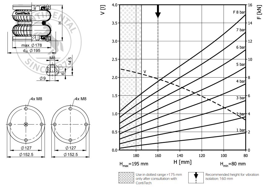 ContiTech FD 76-14 DI CR пневмоподушка. Максимальное рабочее давление 8 бар. Температура эксплуатации -30°C / +70°C. Кратковременно +90°C. Резина – хлорбутадиеновая резина (неопреновая резина).