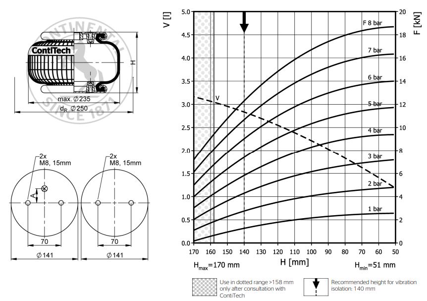 ContiTech FS 120-12 CI пневмоподушка. Максимальное рабочее давление 8 бар. Температура эксплуатации -40°C / +70°C. Резина – натуральный каучук.