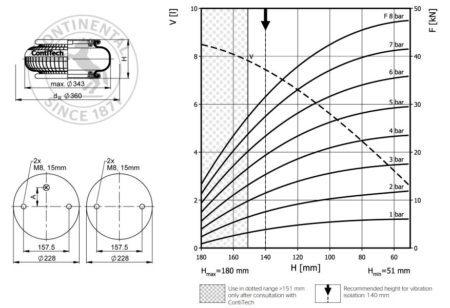 ContiTech FS 330-14 CI пневмоподушка. Максимальное рабочее давление 8 бар. Температура эксплуатации -40°C / +70°C. Резина – натуральный каучук.